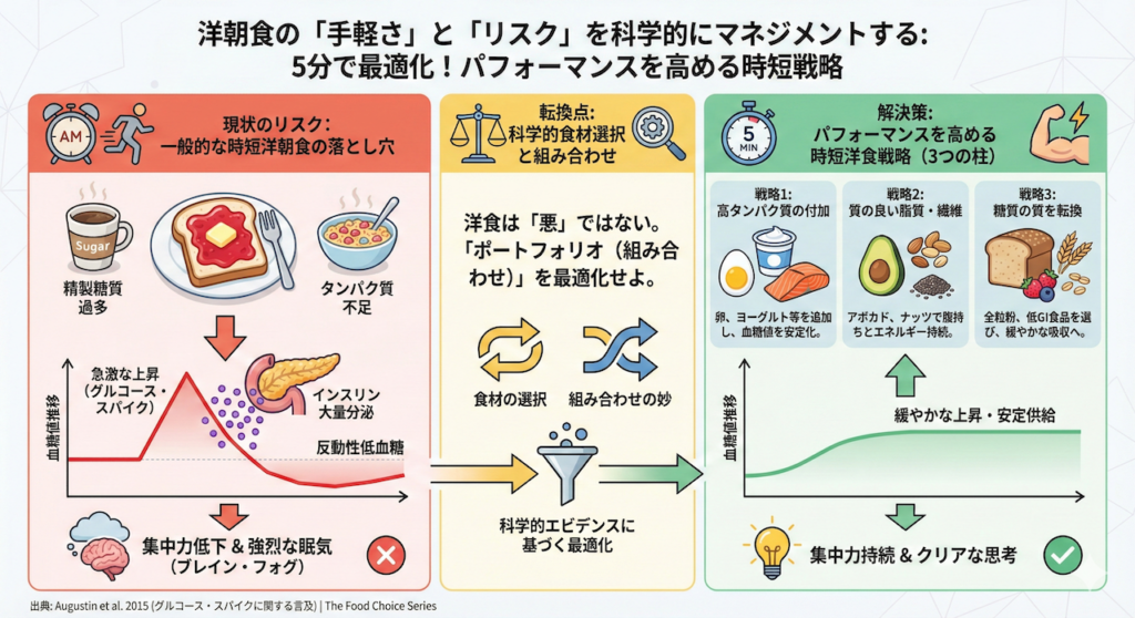 今回は『The Food Choice』シリーズの各論として、時間のない朝でも5分以内で準備でき、かつ医学的エビデンスに基づいた「パフォーマンスを高める時短洋食」のレシピと戦略を3つ、ご提案します。